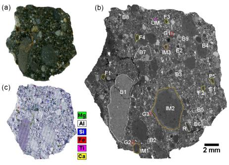 Scanned sample surface image (a), SEM image showing labelled rock fragment names (b), and false-color X-ray element map (c) of lunar meteorite NWA 7948.