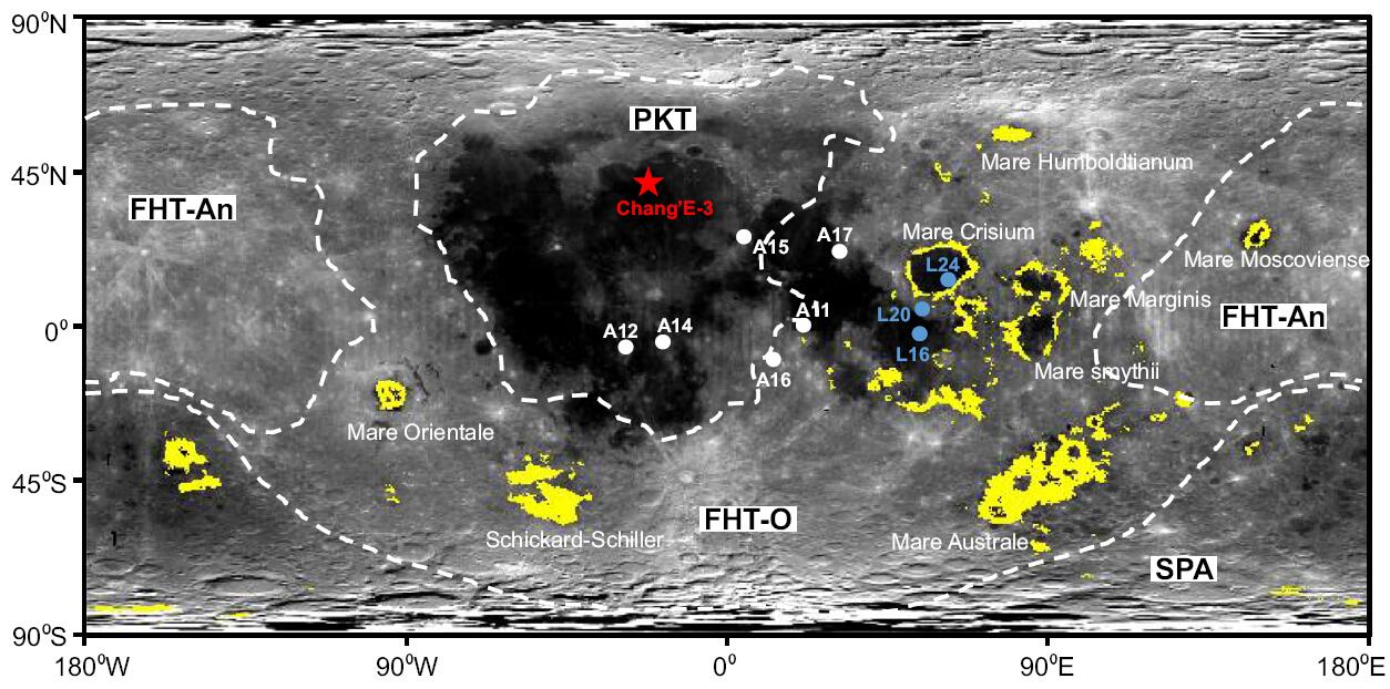 Image showing that the areas where surface regolith FeO and Th contents obtained by the Lunar Prospector Gamma Ray Spectrometer match the chemcial composition of lunar meteorite NWA 7948 in yellow. These yellow regions may represent the source site of the meteorite. The Apollo landing sites(A), Luna landing sites (L) and Chang’E 3 landing site are shown for context along with the made geochemical terranes (PKT, FHT, SPA). Image: adapted from Zeng et al. 2018a (MAPS)