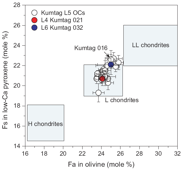 Kumtag 沙漠陨石橄榄石(Fa)和低钙辉石(Fs)成分投图(Zeng et al. 2018)